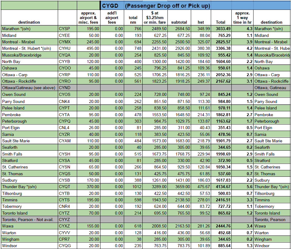 These one-way private charter flights start or end at Goderich Municipal Airport.