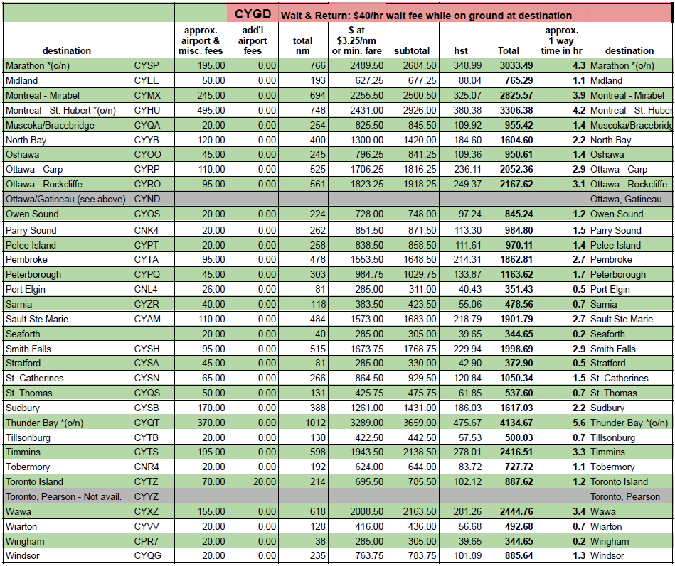 - “(o/n)” refers to mandatory overnight stay at destination due to pilot daily duty limits. In these cases an estimate of $250 has been included in the misc. fees column, the actual amount will be confirmed at the time of booking.