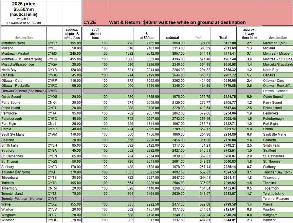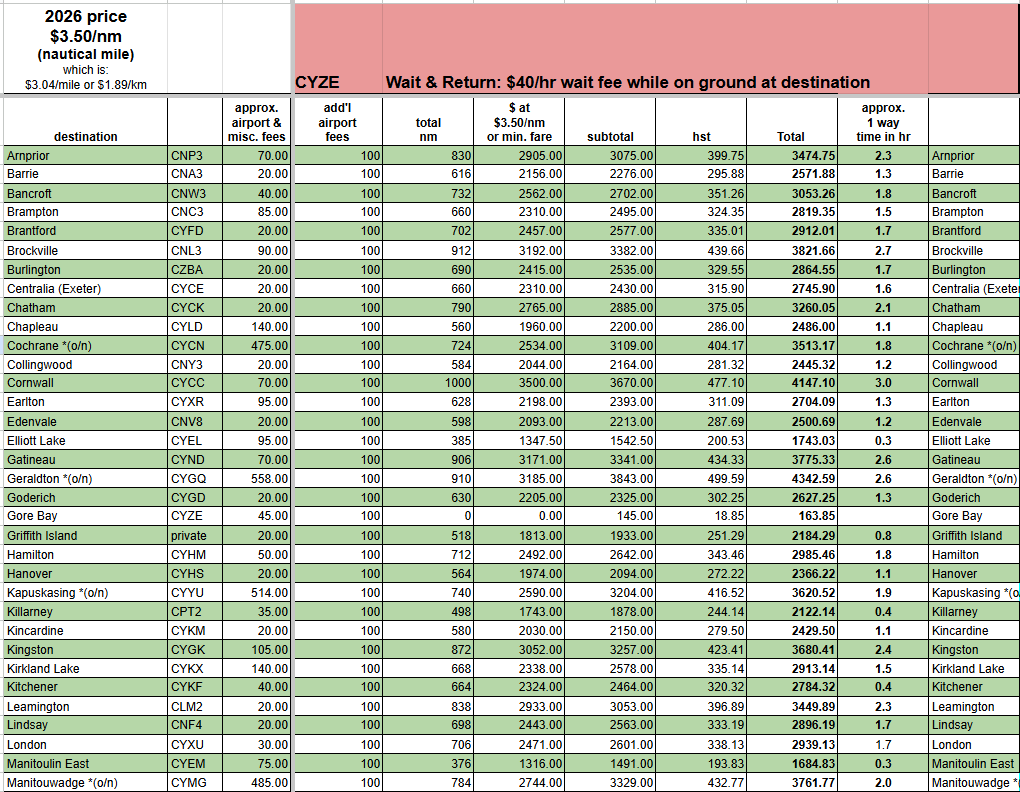 - “approx airport & misc. fees” include: landing fees, parking fees, terminal fees, fuel surcharge, and extra mileage for airport procedures