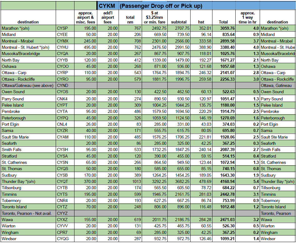 These one-way private charter flights start or end at Kincardine Airport (CYKM).