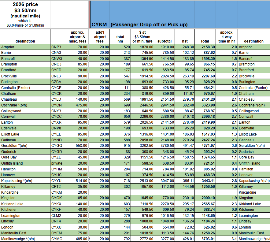These one-way private charter flights start or end at Kincardine Airport (CYKM).