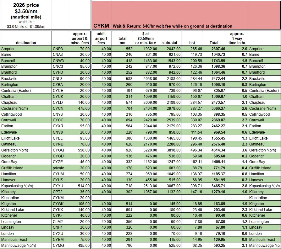 - “approx airport & misc. fees” include: landing fees, parking fees, terminal fees, fuel surcharge, and extra mileage for airport procedures