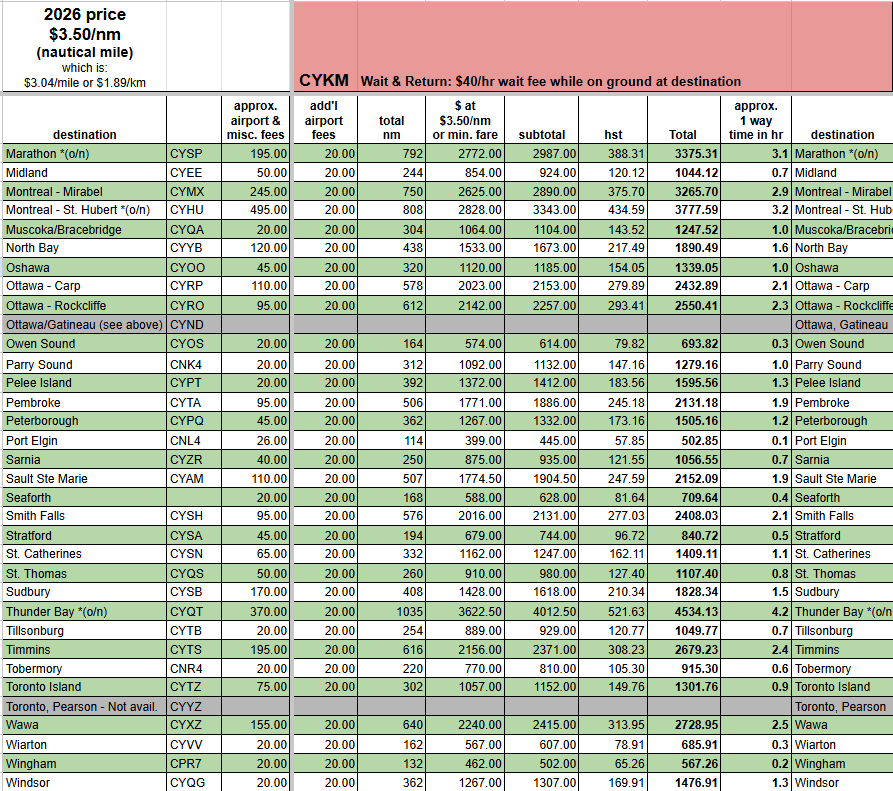 - “(o/n)” refers to mandatory overnight stay at destination due to pilot daily duty limits. In these cases an estimate of $250 has been included in the misc. fees column, the actual amount will be confirmed at the time of booking.