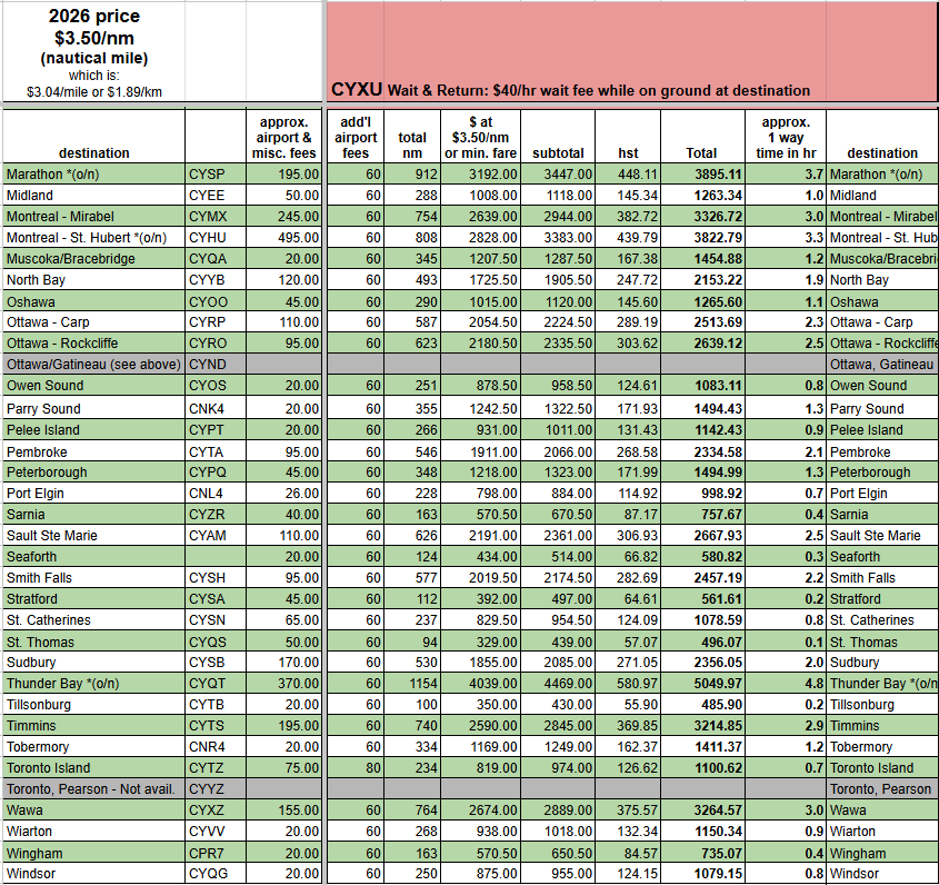 - “approx airport & misc. fees” include: landing fees, parking fees, terminal fees, fuel surcharge, and extra mileage for airport procedures