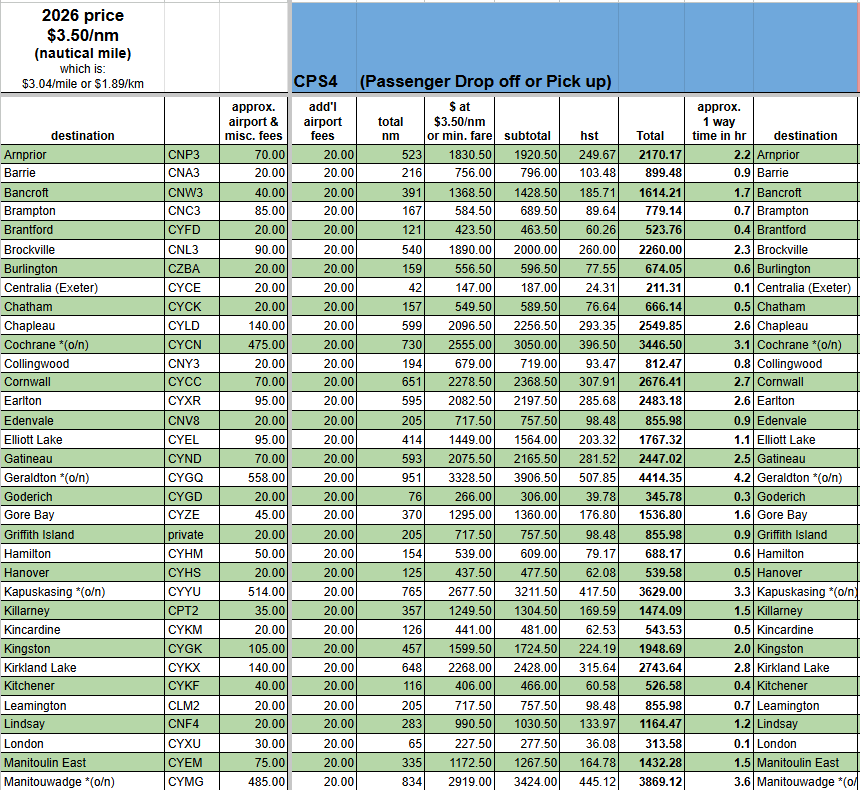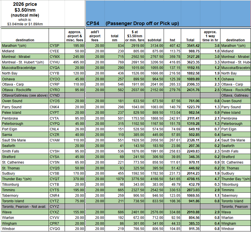 - “(o/n)” refers to mandatory overnight stay at destination due to pilot daily duty limits. In these cases an estimate of $250 has been included in the misc. fees column, the actual amount will be confirmed at the time of booking.