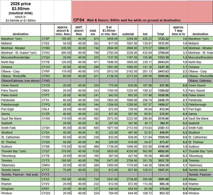 - “(o/n)” refers to mandatory overnight stay at destination due to pilot daily duty limits. In these cases an estimate of $250 has been included in the misc. fees column, the actual amount will be confirmed at the time of booking.