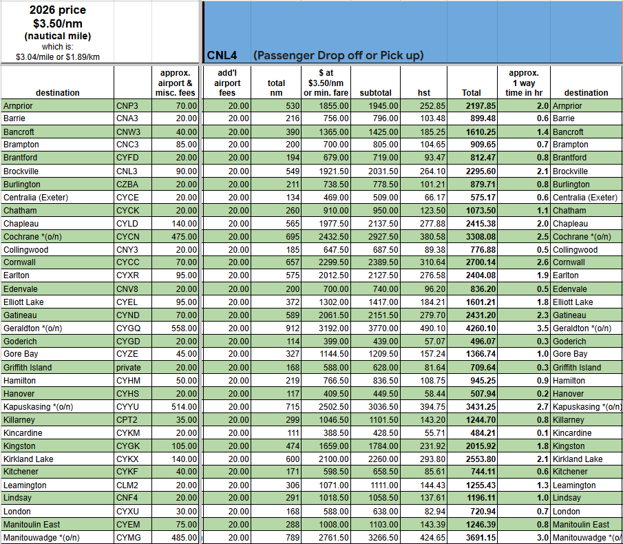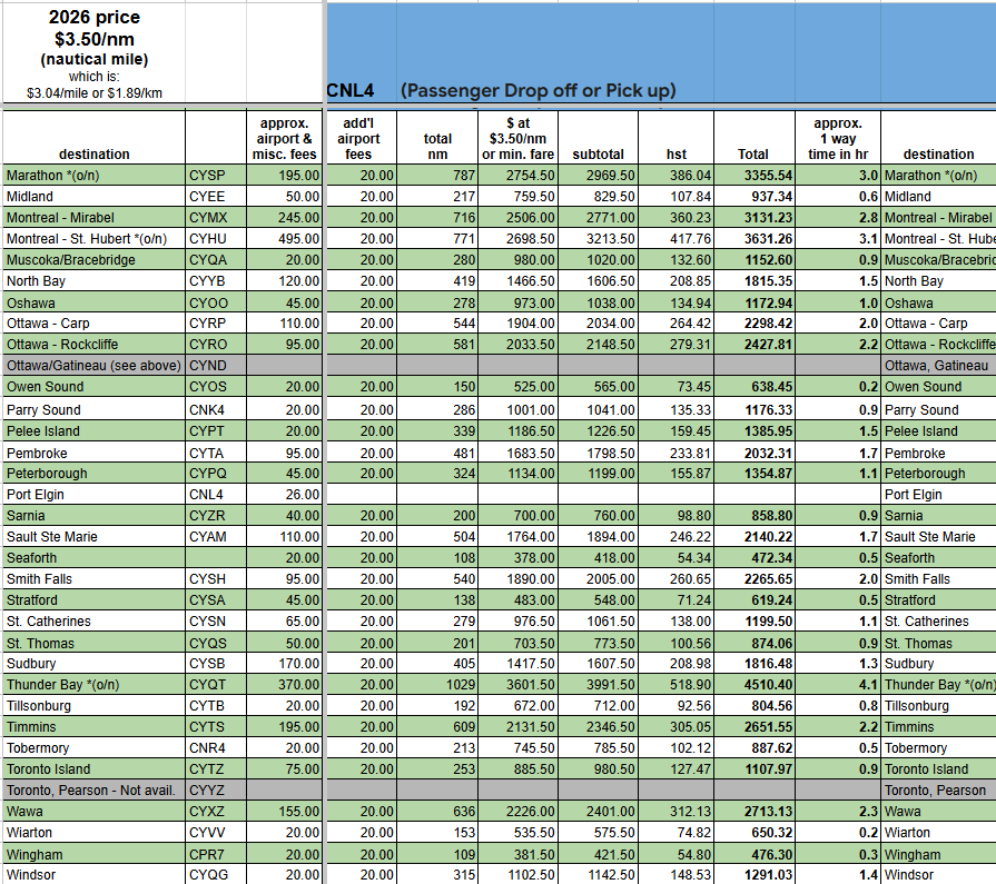 - “approx airport & misc. fees” include: landing fees, parking fees, terminal fees, fuel surcharge, and extra mileage for airport procedures