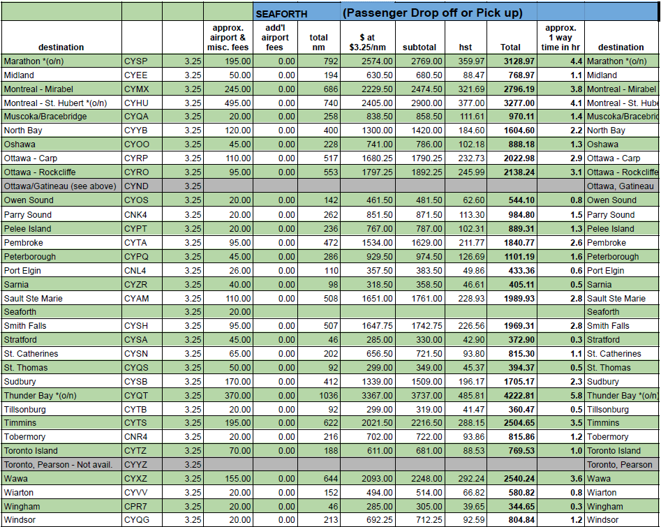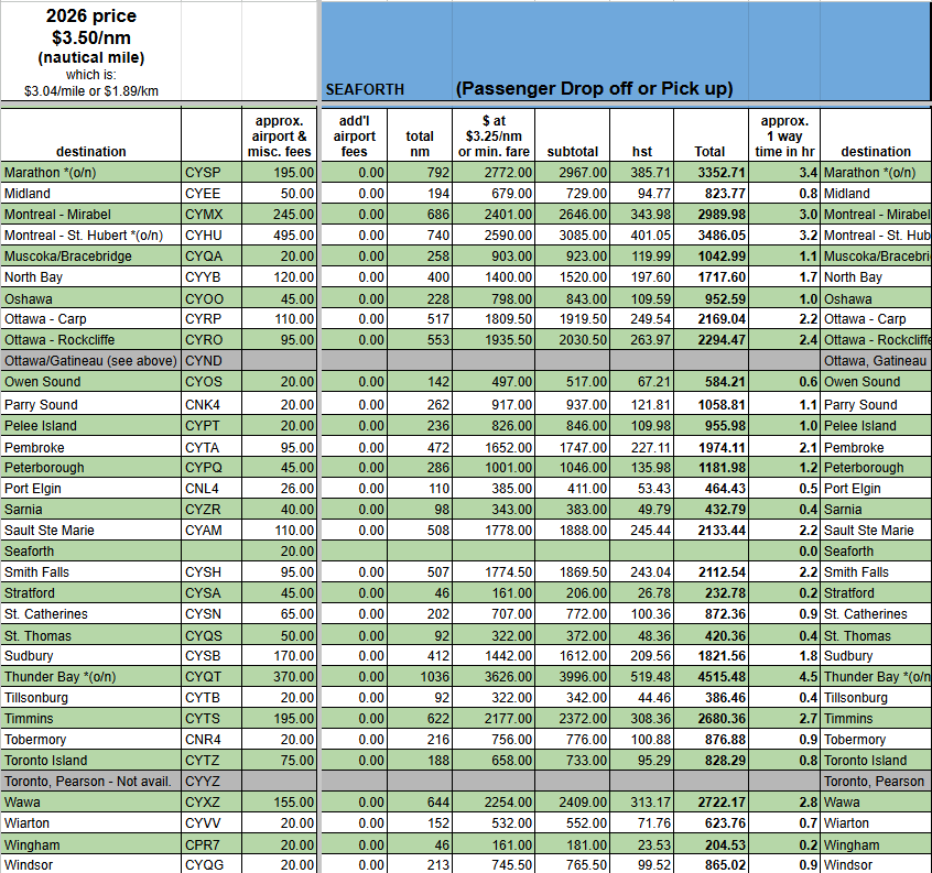 These one-way private charter flights start or end at our Seaforth aerodrome.