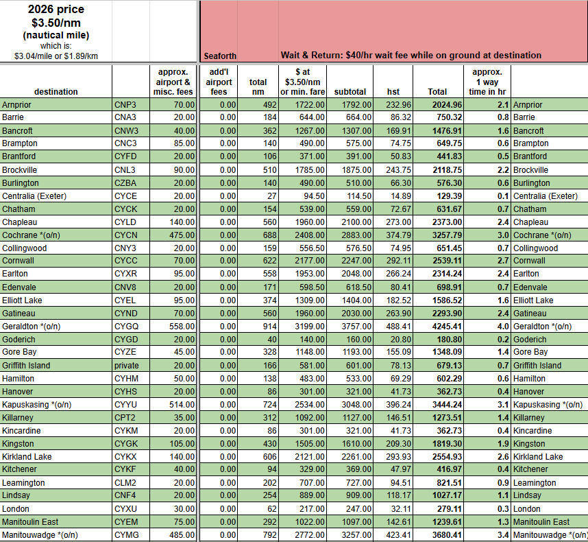 Prices listed are for a planeload (not per person) of up to 3 passengers. Information listed is accurate at the time of posting, prices will be confirmed at the time of booking.