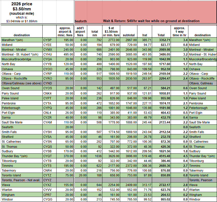 - “approx airport & misc. fees” include: landing fees, parking fees, terminal fees, fuel surcharge, and extra mileage for airport procedures