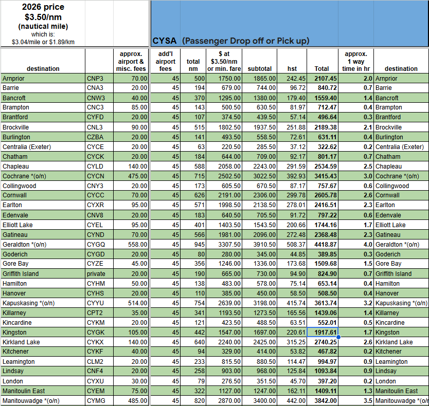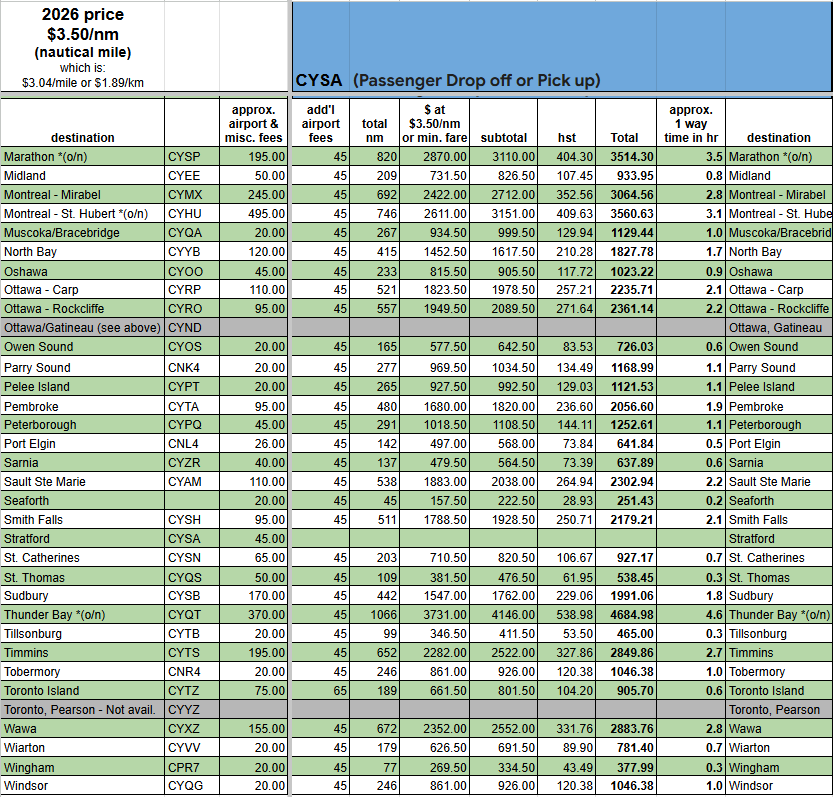 - “approx airport & misc. fees” include: landing fees, parking fees, terminal fees, fuel surcharge, and extra mileage for airport procedures