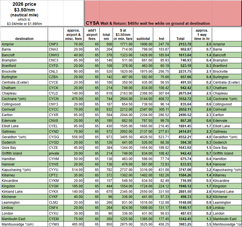- “approx airport & misc. fees” include: landing fees, parking fees, terminal fees, fuel surcharge, and extra mileage for airport procedures