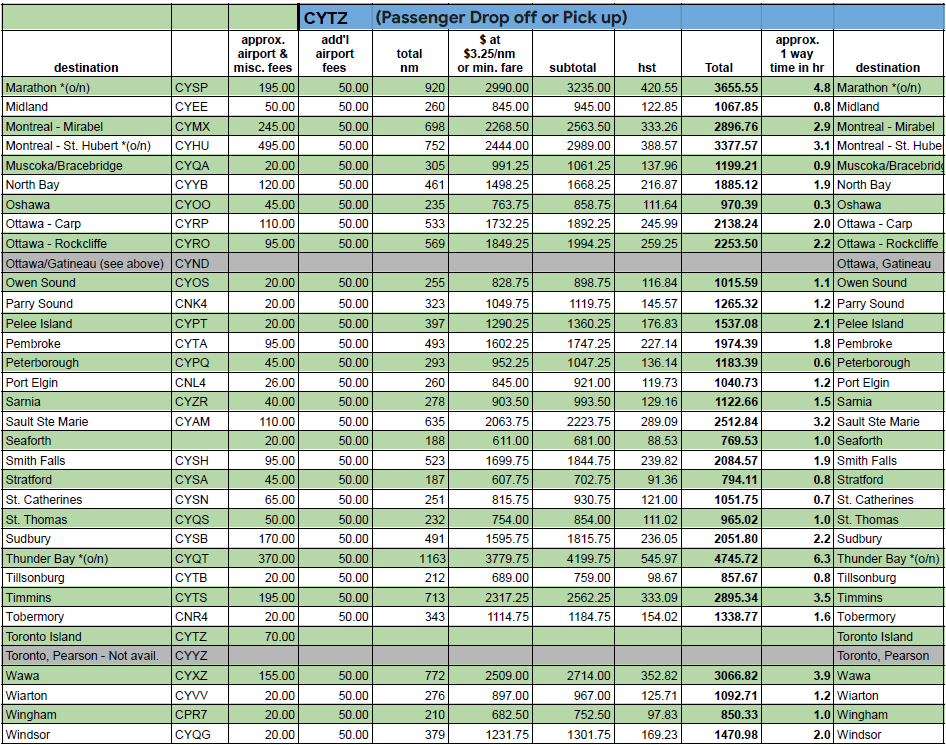 - “(o/n)” refers to mandatory overnight stay at destination due to pilot daily duty limits. In these cases an estimate of $250 has been included in the misc. fees column, the actual amount will be confirmed at the time of booking.