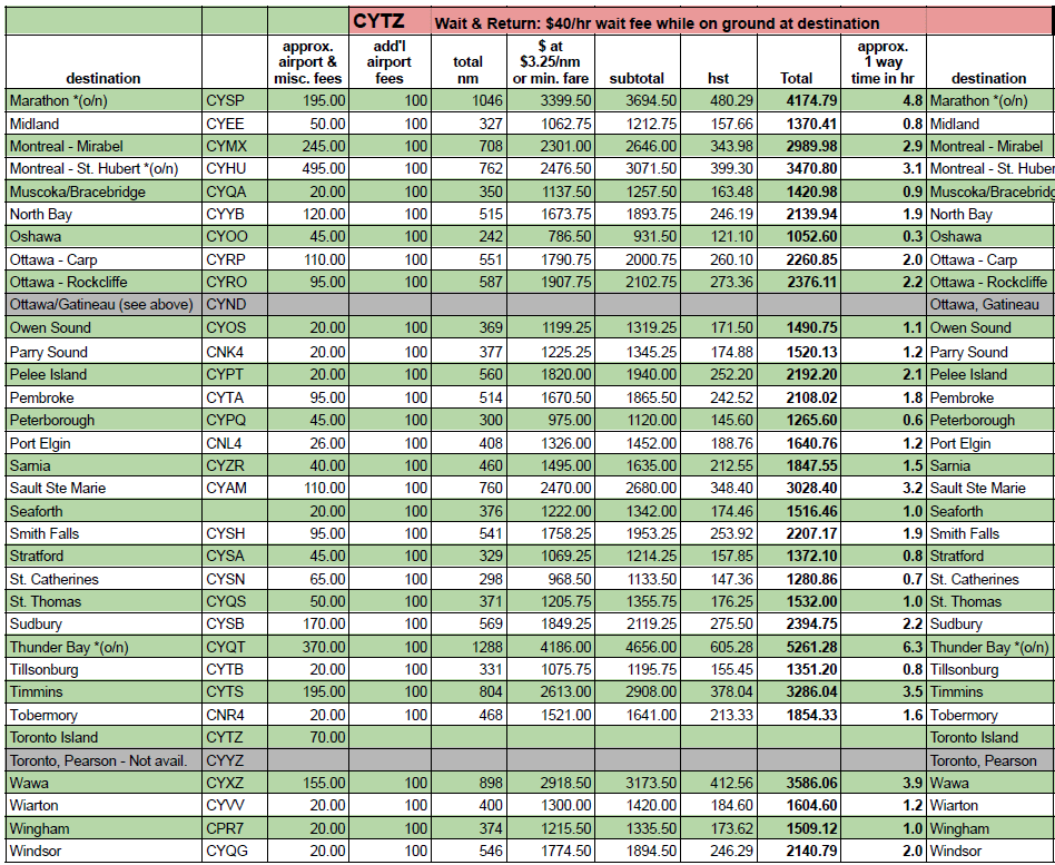 - “approx airport & misc. fees” include: landing fees, parking fees, terminal fees, fuel surcharge, and extra mileage for airport procedures
