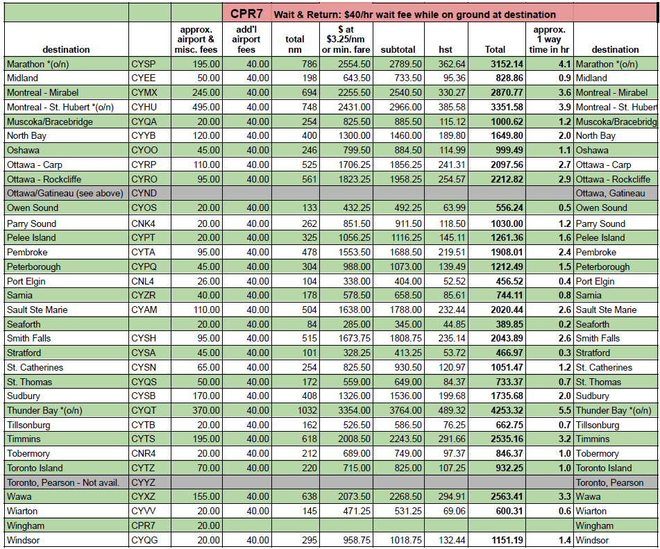 - “(o/n)” refers to mandatory overnight stay at destination due to pilot daily duty limits. In these cases an estimate of $250 has been included in the misc. fees column, the actual amount will be confirmed at the time of booking.