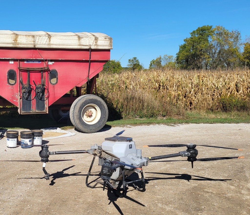 We offer custom agricultural drone services, such as cover crop spreading, dry fertilizer application, and spraying with our T40 drone, based at our Seaforth farm.