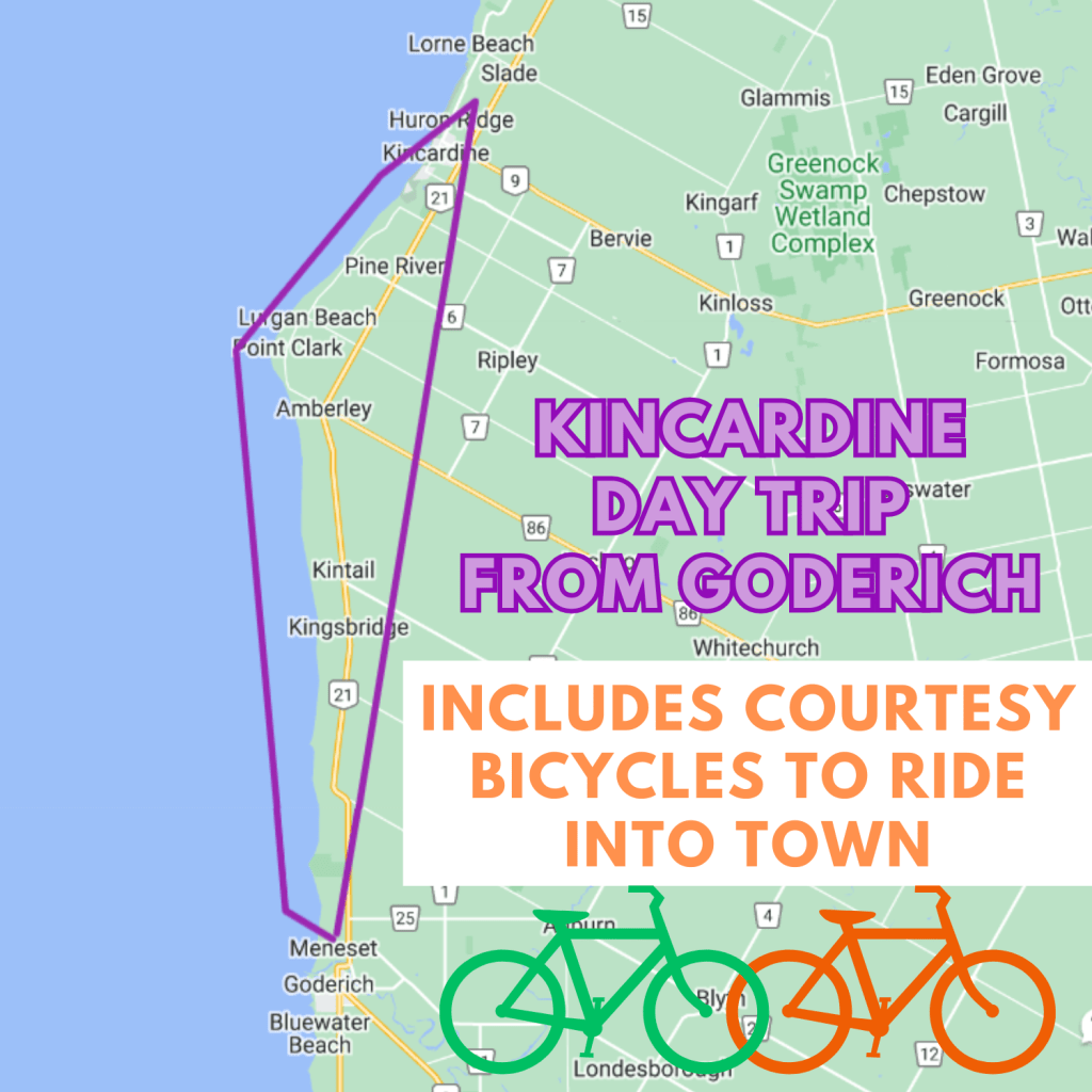 Fly from Goderich to Kincardine with approx. a 6 hour stop, and a return flight to Goderich. While in Kincardine enjoy a meal out, go to the beach, and explore trails or the town. Flight can be used by a group of 6 with 3 people flying each way. Meal while in Kincardine not included. Bicycles available to borrow (no charge) at the airport to enjoy the many biking trails around Kincardine, we can help you get to the trails without going on the highway. This map shows maps and descriptions of the trails in the area, here’s another version of the map
