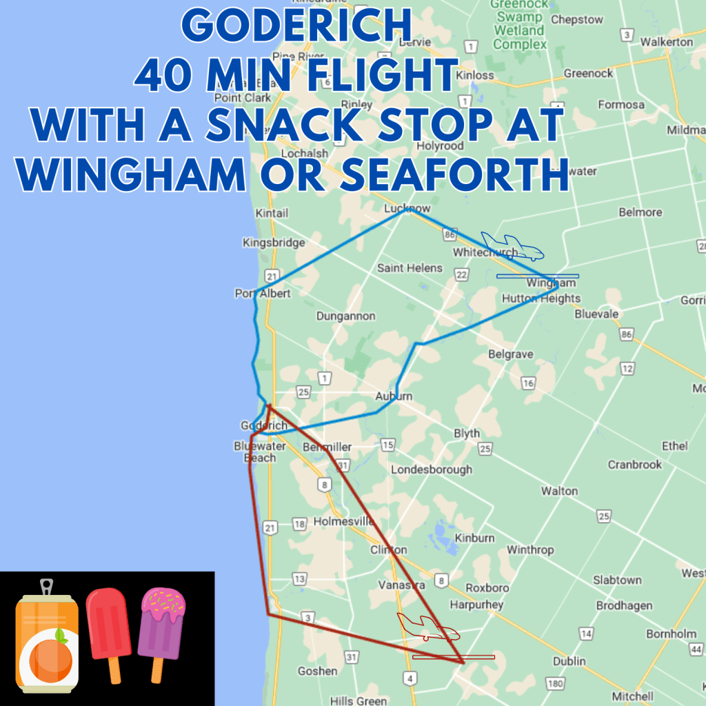 Blue Route – Wingham stop: Fly up the coast from Goderich to Port Albert, inland over Lucknow, and land at Wingham airport where you’ll have time for a 15 min snack stop (drink or ice cream bar included). Then you’ll fly along the Maitland River back to Goderich, 40 mins airtime, 55 mins total trip. (Please note, this flight does not go as far north as Point Clark)