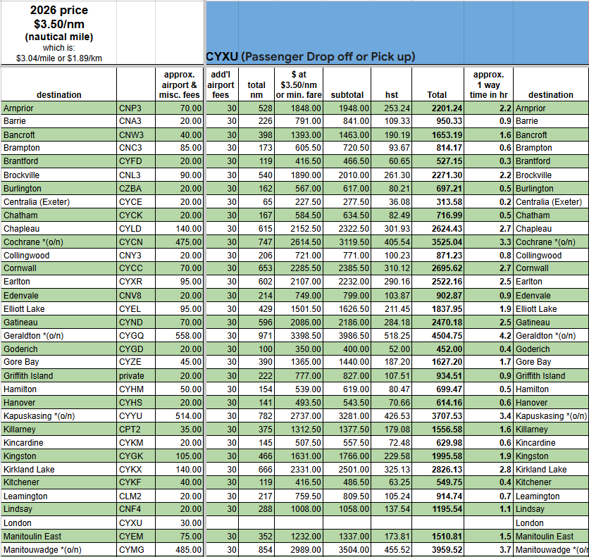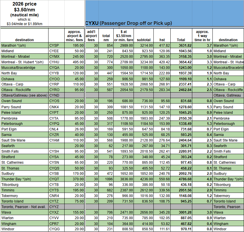 - “approx airport & misc. fees” include: landing fees, parking fees, terminal fees, fuel surcharge, and extra mileage for airport procedures