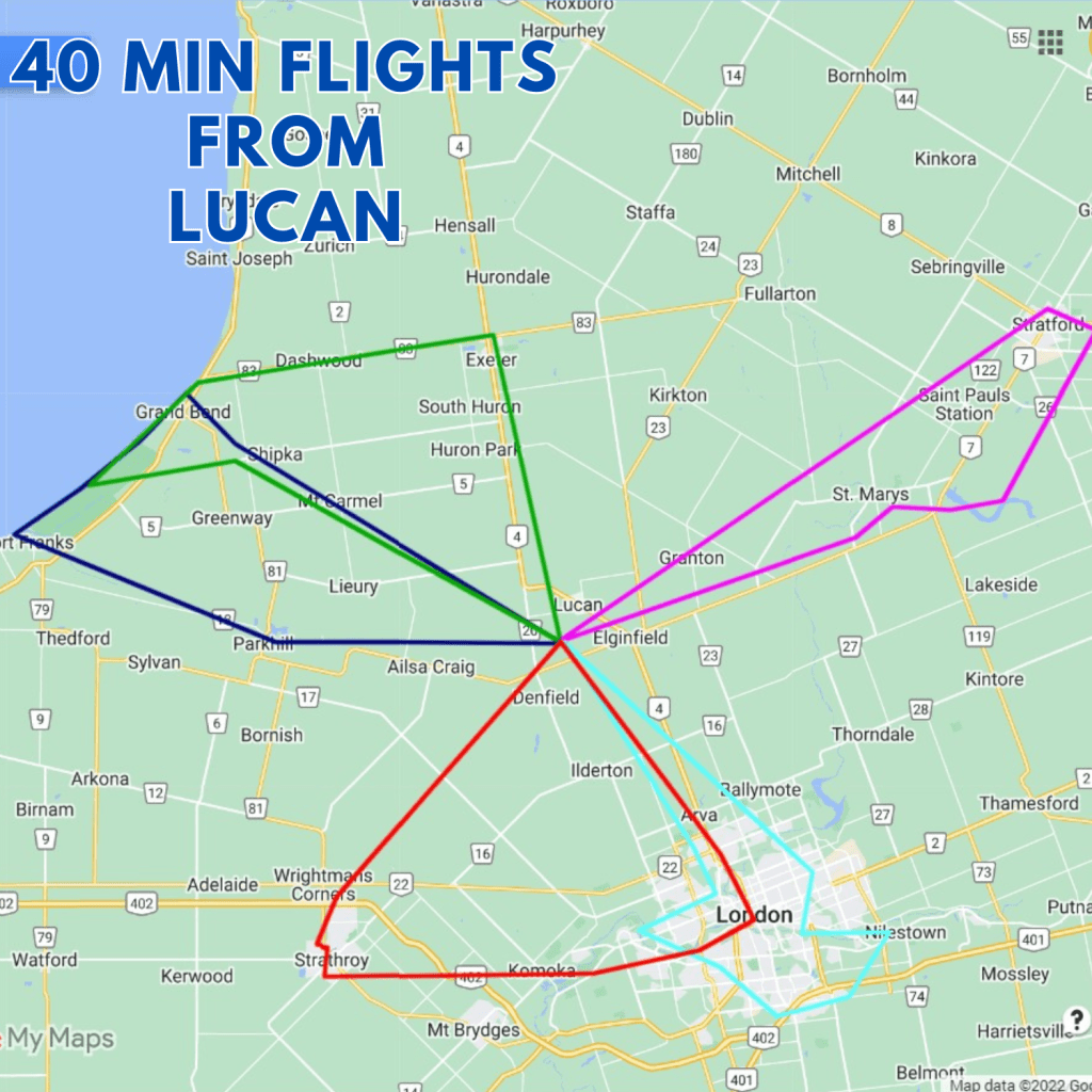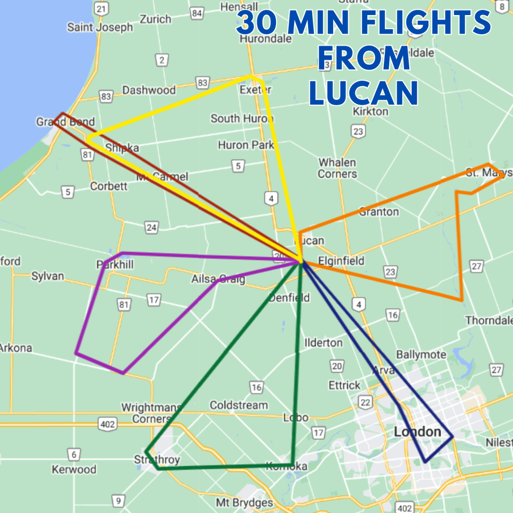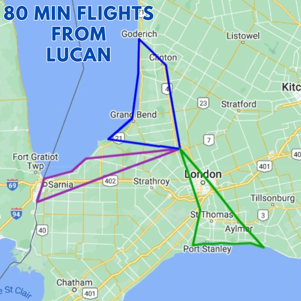Flights available from Lucan airport 1-2 days/month from summer until fall. Additional dates may be added throughout the season. All of our standard gift certificates (10min, 20min, 40min, 60min, & 80min) can be used from this location, even if the gift certificate doesn’t list this airport.