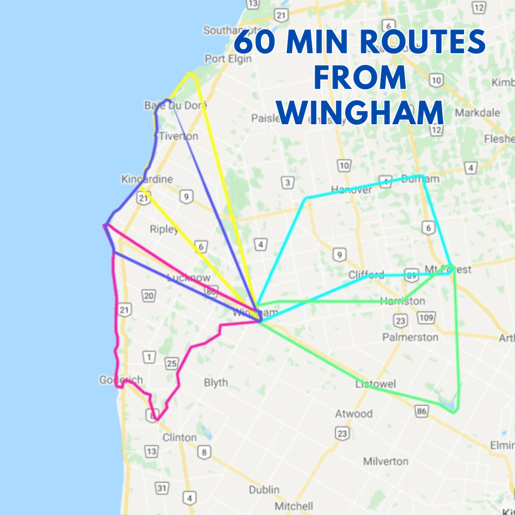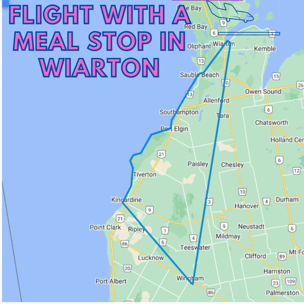 Fly from Wingham to Kincardine, along the lake past Bruce Power, Port Elgin, Southampton, and Sauble Beach to land at Wiarton airport with approx. 1 hour for your meal at Hungry Hangar, right at the airport, and then return inland to Seaforth.