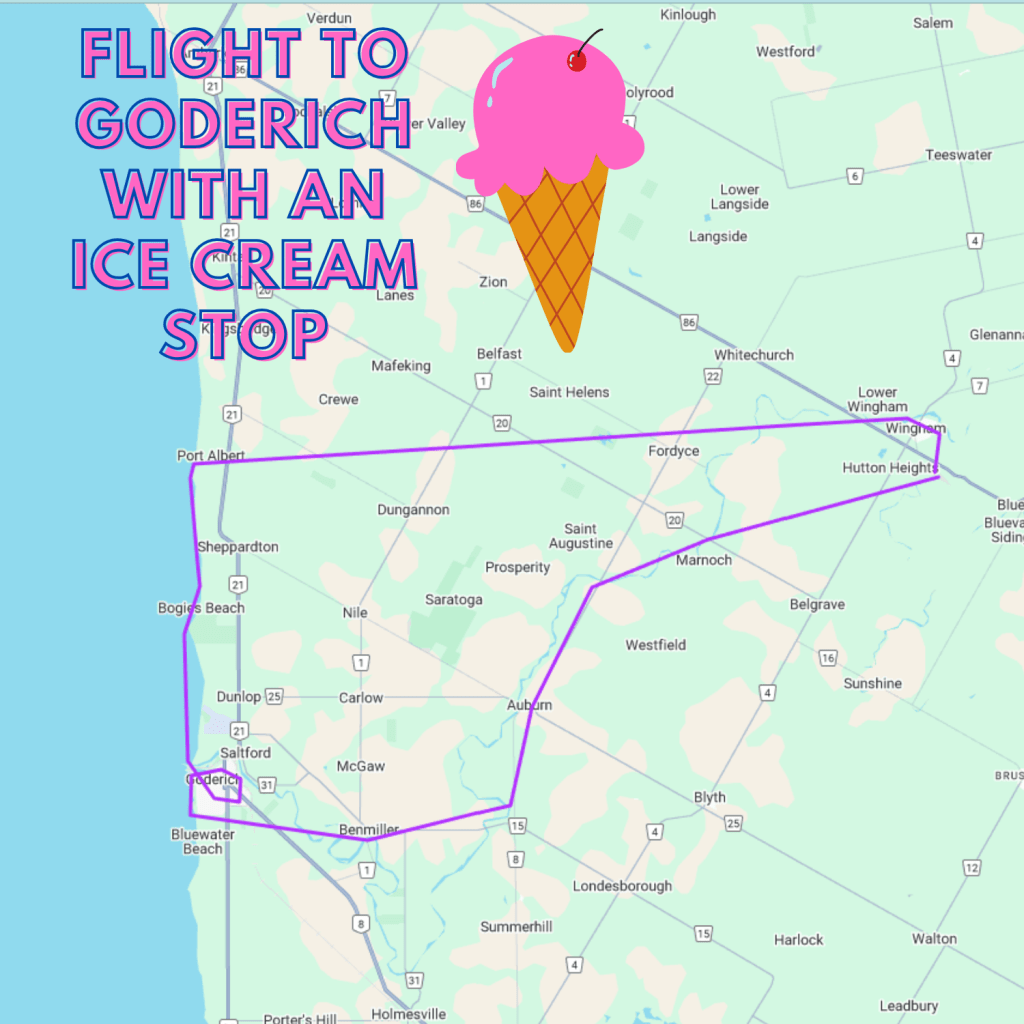 Fly from Wingham along the Maitland River, over Auburn and Benmiller, to Goderich where you’ll enjoy views of the beach, The Square, the harbour, and the whole town. We’ll land at Goderich airport and park near the restaurants at the end of the runway. You’ll have time to enjoy an ice cream (not included) at one of the restaurants before your return flight north along the coast over Port Albert and back to Wingham. A group of 6 could split this to fly 3 people each way.